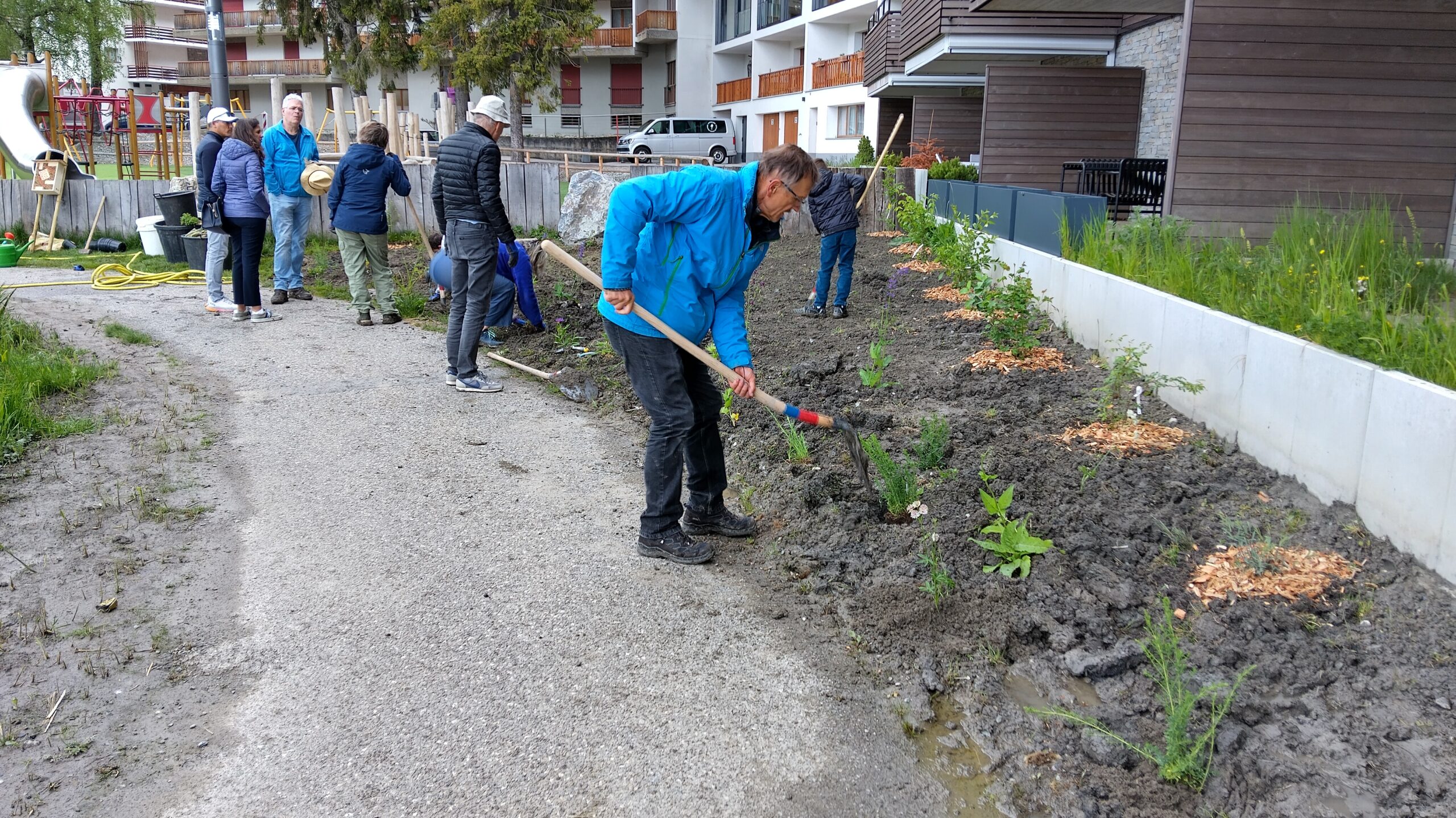 - Plantation d’arbustes et vivaces indigènes, pose d’un hôtel à insectes, semis de prairie fleurie